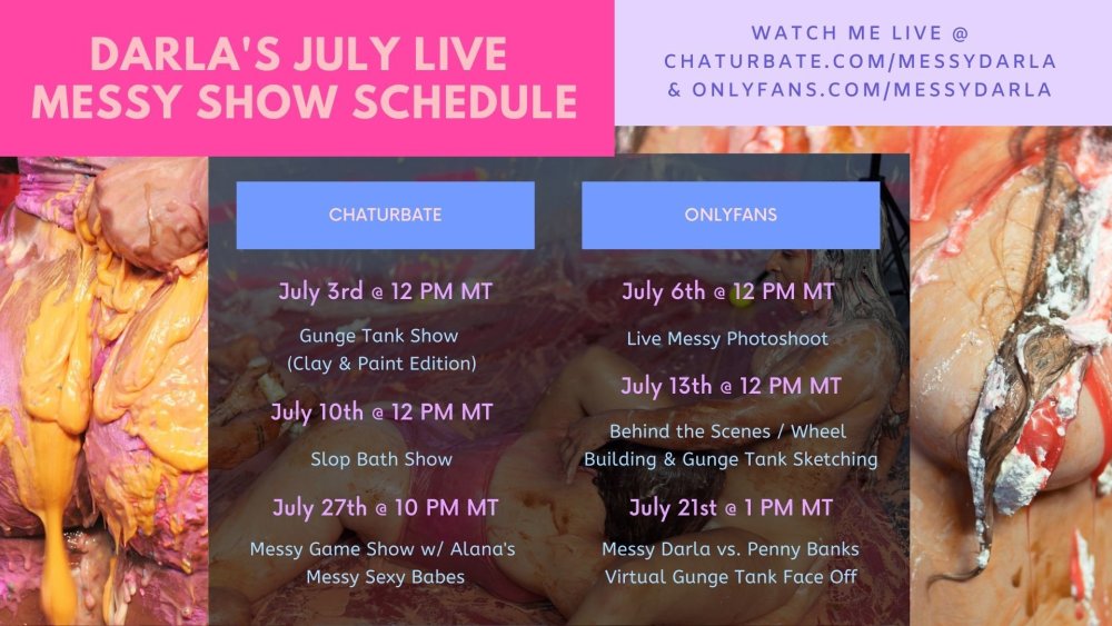 Hi all !! July's live messy show schedule is officially out :love: there are SO many amazing shows on the menu !! We'll be starting out the month with a show dedicated to my homemade gunge tank. It will be my very first time sploshing with paint, and I loved clay so much that I had to bring it back for another show !!