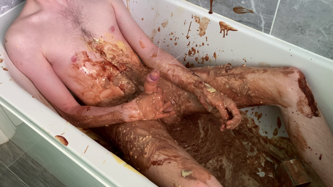 The scene starts with me stepping into the bathtub. I sit down and start to jerk off. I'm super horny so I've grabbed some sweet messy foods from the cupboard for an impromptu messy session. I start off by pouring custard over my cock, while I continue to jerk off. I empty the whole carton, enjoying the feeling of it on my hard dick. Next up I empty a can of condensed milk on me. It's very runny and a bit cold! Then next I move onto a tin of clumpy rice pudding. This was my first time getting messy with rice pudding and I absolutely loved it. The way it felt running all over me, with it's clumps and liquid! It felt amazing! I keep jerking off throughout all of this. Then I grab a bottle of chocolate sauce and begin to pour it onto my cock. It's so sticky and it feels amazing. I slowly empty the bottle onto me, while rubbing and massaging it into myself. Next I turn around, get on all fours and grab my second box of custard. I pour it all over my big ass! I make sure to rub it in before returning to jerking off. I then proceed to pour the second cans and bottle of evaporated milk, rice pudding and chocolate sauce onto my dick. I love how they all feel and as I go I'm getting closer and closer to orgasm. I start collecting up the mess into one of the custard boxes and re-pour it onto my dick until eventually I blow my load and shot a huge load of cum!